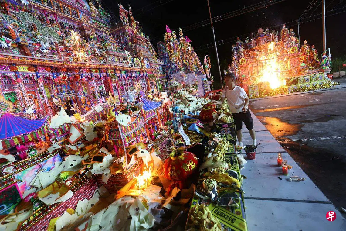 本地纸扎师傅施成业(65岁)上星期天(6月30日)在双溪登雅路专门焚烧大型祭品的地方举行祭祀仪式,亲手焚烧这个宽60英尺、高27英尺的纸扎屋。