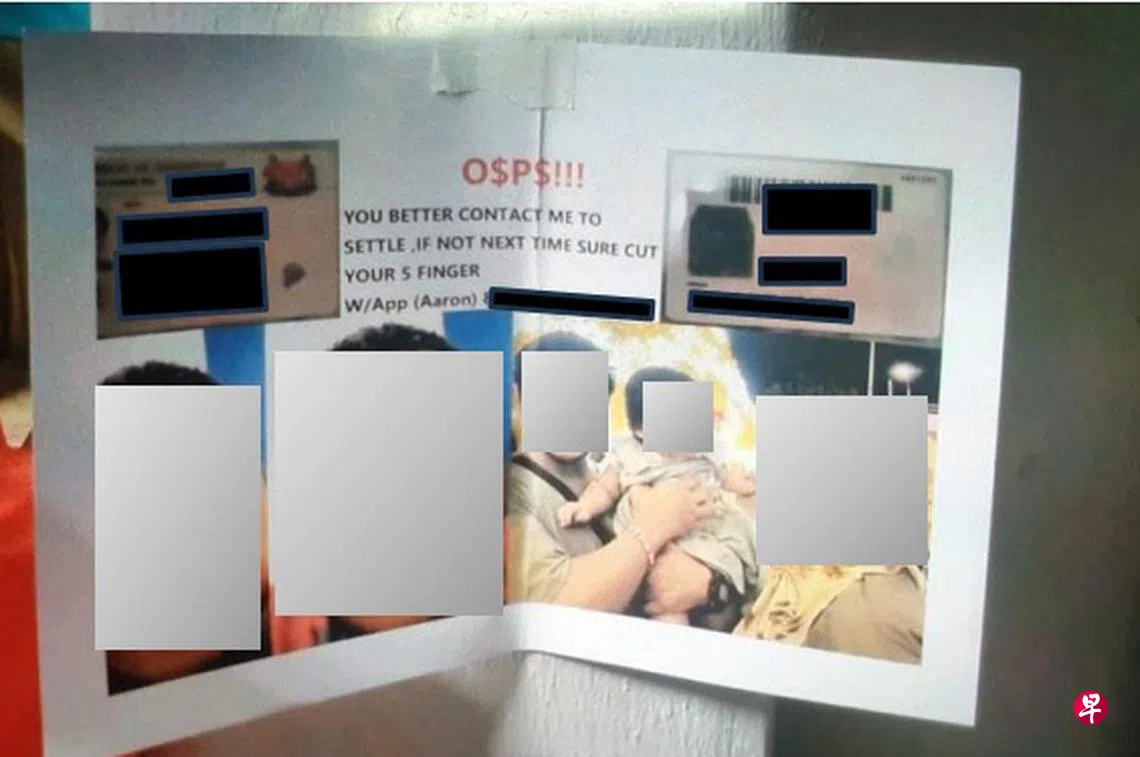 男子退还不明转账 遭大耳窿骚扰强索利息订户赠阅文章大耳窿把印有受害者全家福的字条贴在门口。 (警方提供)男子称贷款还清债务,却还收到不明转账的钱,退还之后对方竟开口要利息,还开始骚扰他,甚至在家门口贴上印有他和家人照片的字条。 这起事件发生在裕廊西41街第463座组屋单位。 警方于7月4日接获一起大耳窿骚扰事件的报案,受影响居民的单位外被贴上字条。大耳窿骚扰上一篇国际生入学考试报名首日 平台故障导致无法提交申请下一篇男子在脸书公然招跑腿 从马国带“壮阳糖”购买此文章