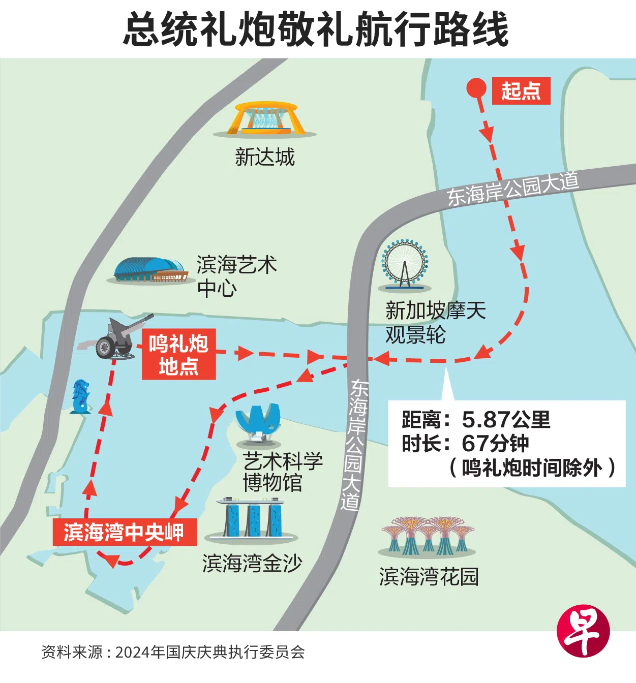 载着四门25磅礼炮的M3G舟桥车(Mobility 3rd Generation Military Float Bridge),将在国庆日当天,从尼诰大道地铁站附近的岸边出发,一路南行,经过新加坡摩天观景轮岸边,从薛尓思桥、海湾桥(Bayfront Bridge)和滨海湾螺旋桥底下穿过,航行到滨海湾金沙艺术科学博物馆岸外,直到滨海湾中央岬(Promontory)岸边,让观众近距离观赏M3G舟桥车的风采,再续航至鱼尾狮和滨海艺术中心之间的水域。