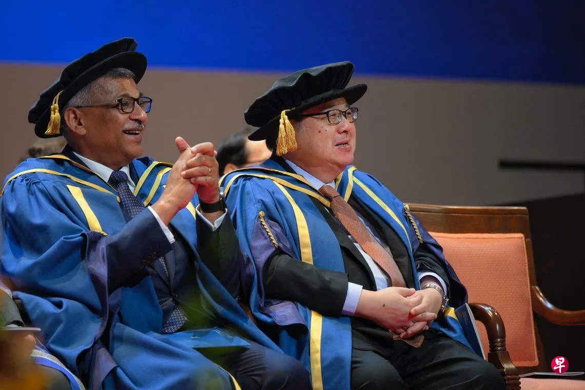 梅达顺和何学渊星期四(7月11日)在国大今年首场毕业典礼上,从国大名誉校长尚达曼总统手中,分别接过名誉法学博士学位和名誉文学博士学位。这是尚达曼出任总统后,首次以名誉校长身份主持国大毕业典礼。