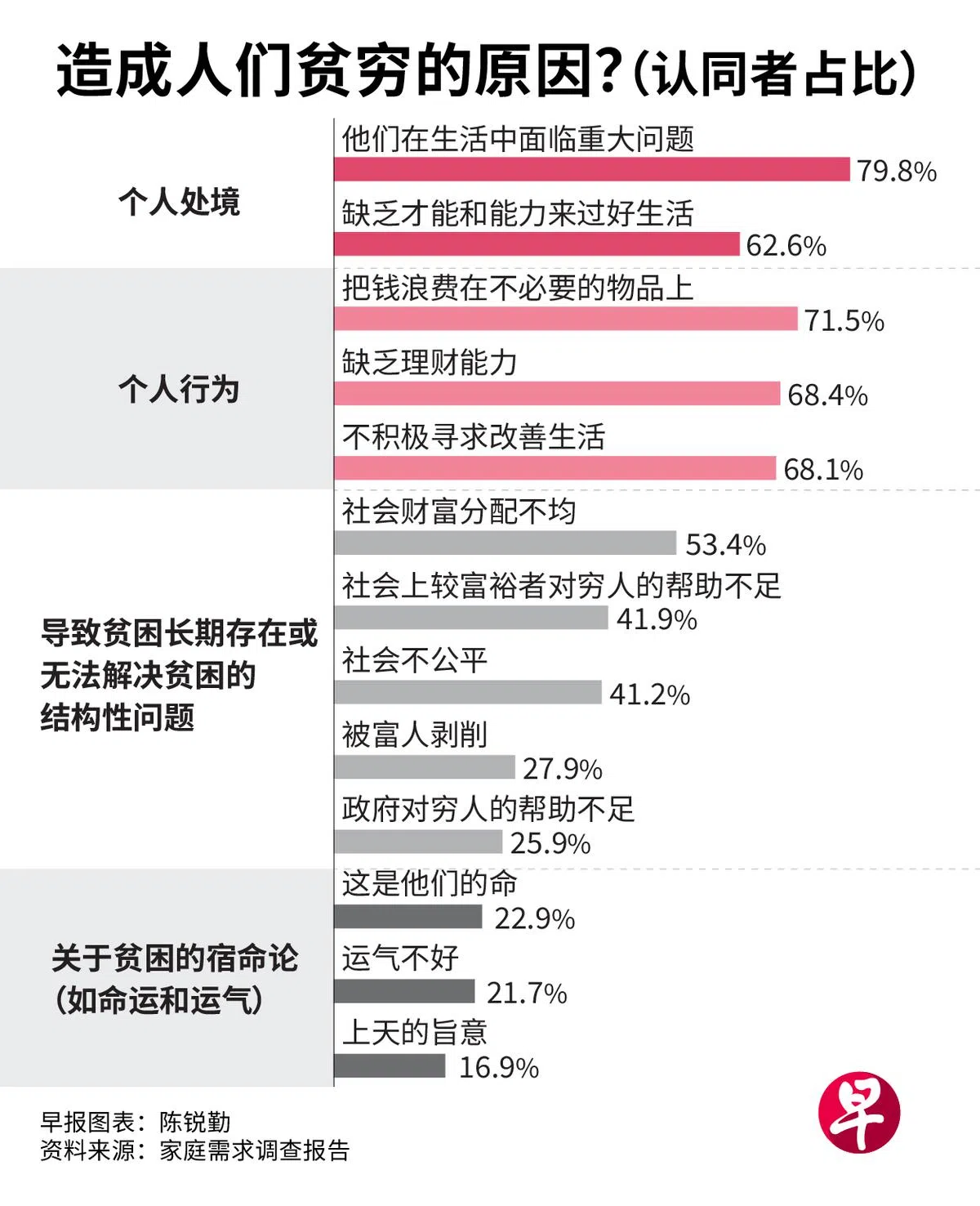 大多数新加坡居民认为,导致贫困的主要原因是个人的行为和处境,只有少数人把贫穷归咎于宿命。