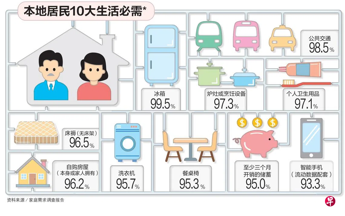 本地居民选出的10大必需,离不开衣食住行,包括冰箱、公共交通和拥屋,九成以上受访者认为这些都必须要有。他们既务实也讲求生活保障,把拥有至少三个月开销的积蓄,看得比冷气机或旅游这类舒适和享乐的项目重要。