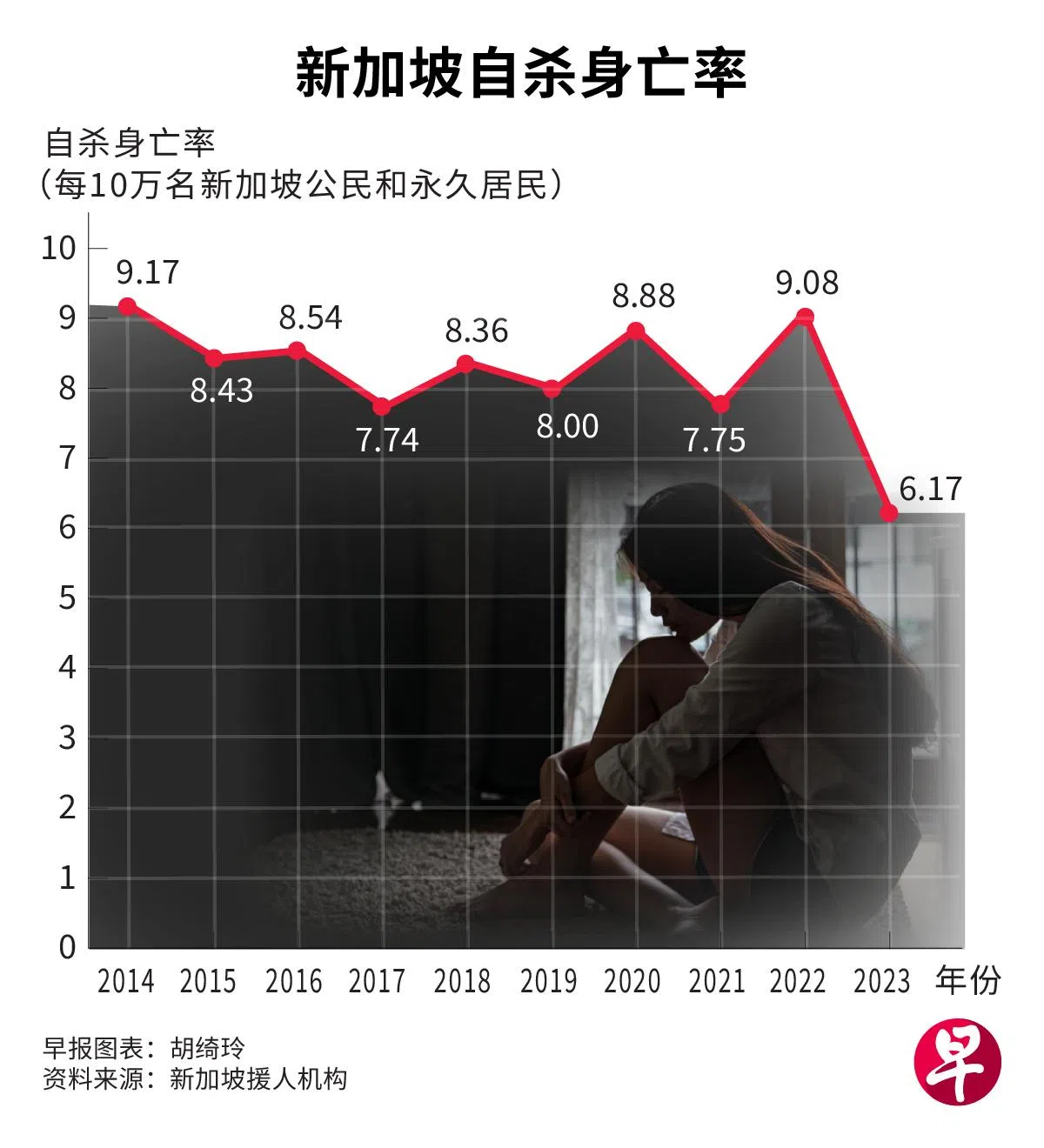 根据新加坡援人机构(Samaritans of Singapore,简称SOS)星期五(7月12日)公布的年度统计数据,去年每10万名新加坡公民和永久居民中,有6.17人自杀身亡。在自寻短见的322人当中,222人是男性,100人是女性。