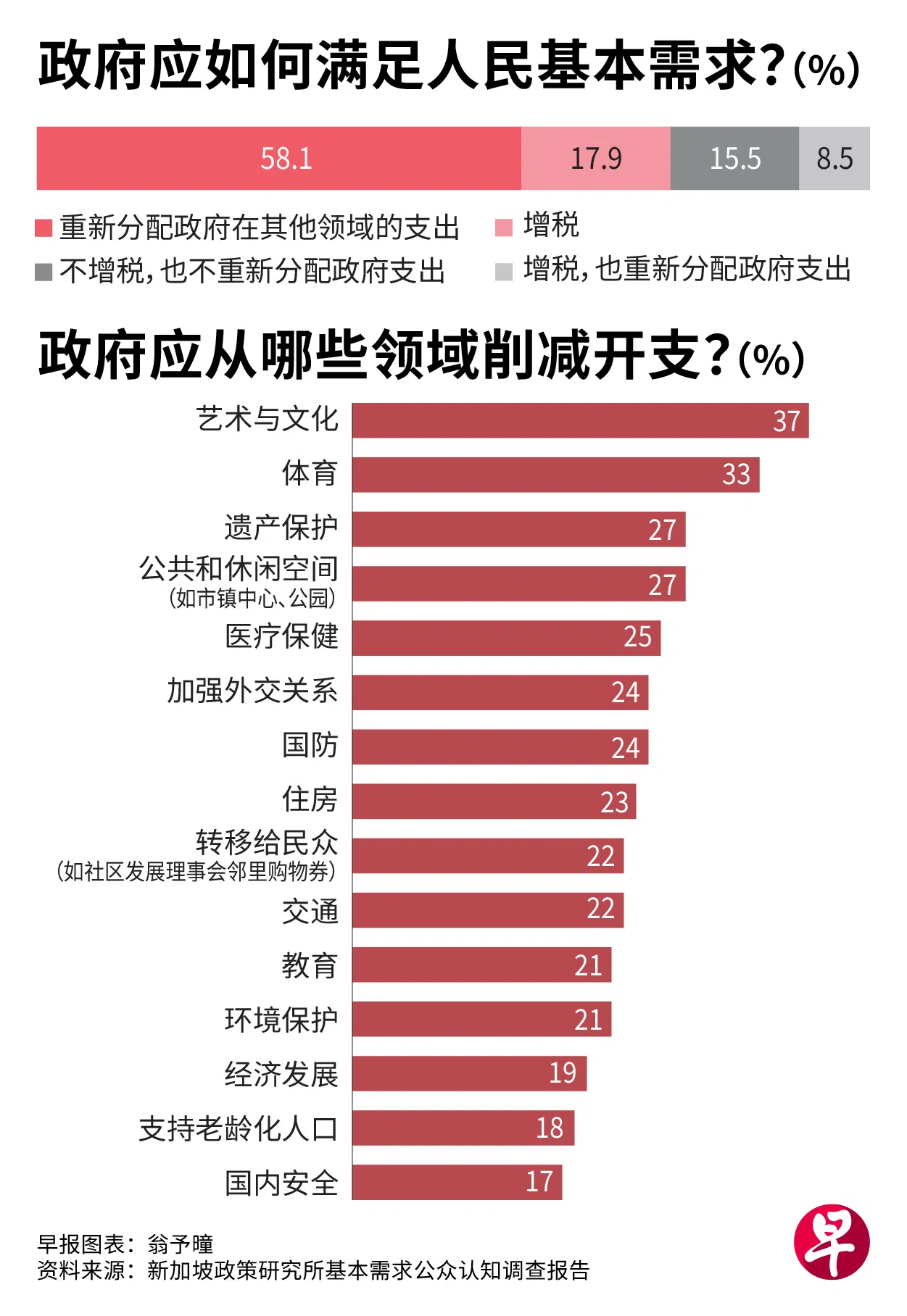 多数新加坡居民希望通过重新分配政府在其他领域的支出来帮助无法负担基本生活需求的人。至于从哪里重新分配政府资源,艺术与文化、体育和遗产保护领域,被最多人选为可抽取资源的领域。