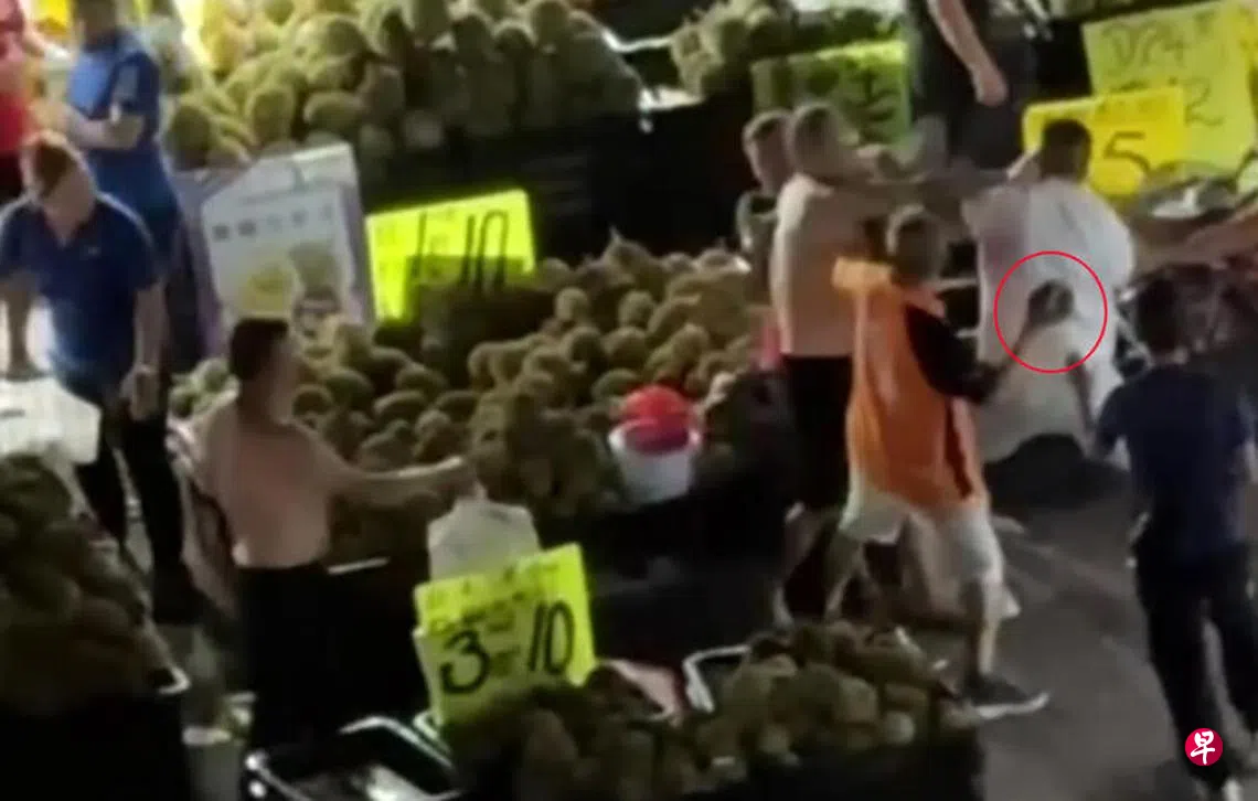 疑不满榴梿摊的顾客人龙挡路,蔬果摊老板与榴梿摊父子档交涉,双方一言不和大打出手,有人以榴梿砸头、有人亮刀,三人齐被捕。