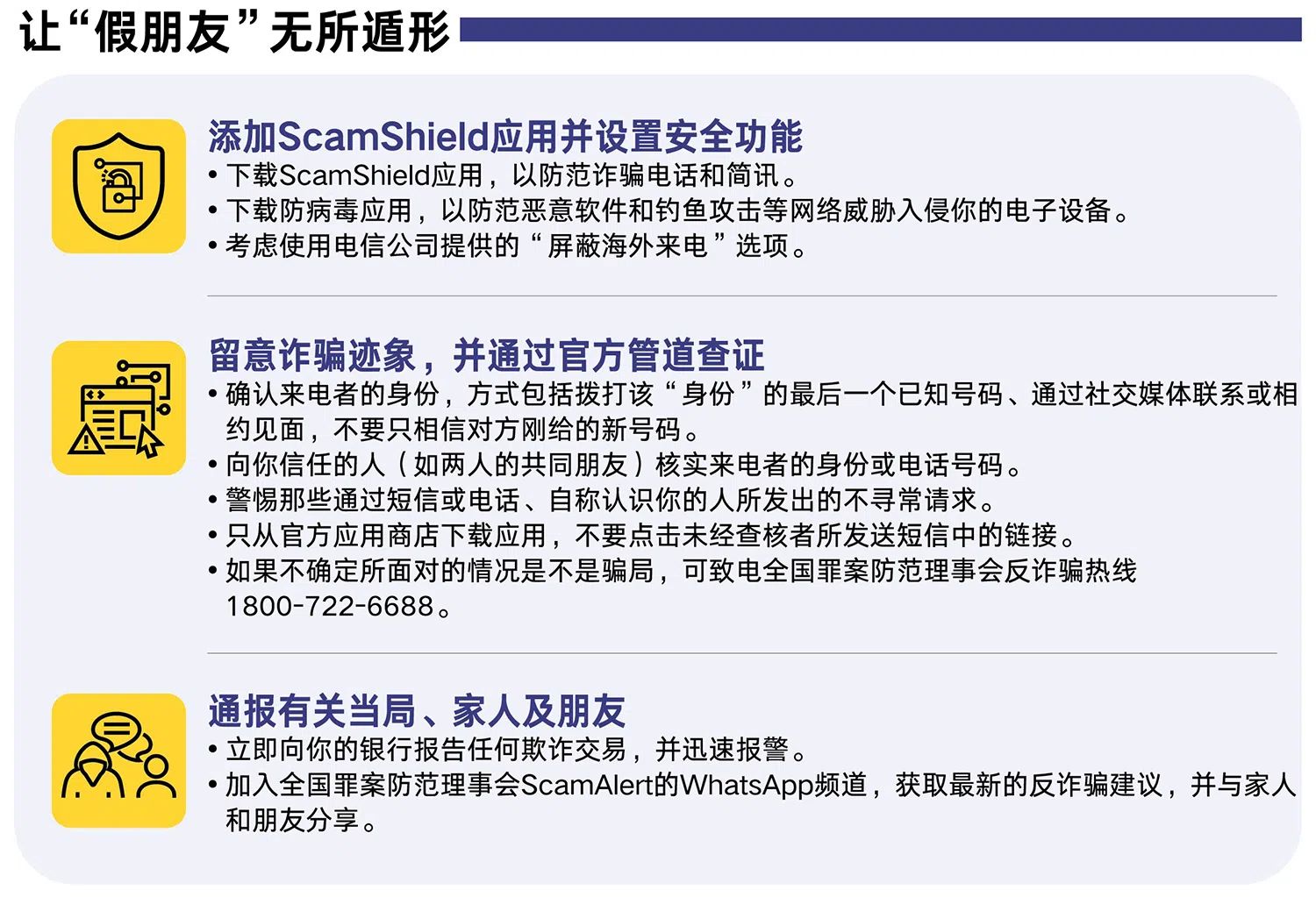 新加坡警察部队行动局反诈骗公众教育局助理局长罗茜·安·麦金泰尔(Rosie Ann Mcintyre)警监表示,假朋友来电骗案中的骗子往往会先假装是受害者认识的人,建立信任后,再要求帮助或借钱。