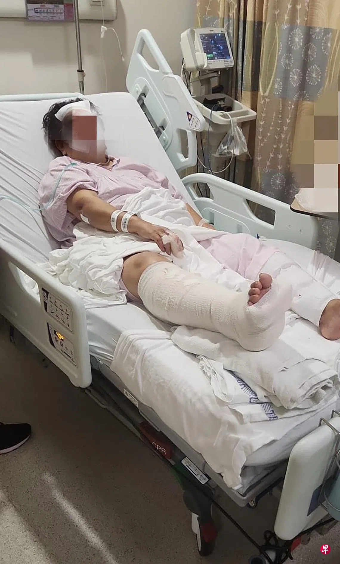 张女士提供的照片显示,母亲的右腿包扎起来,并且需要剃掉额头部分头发以为伤口缝针。