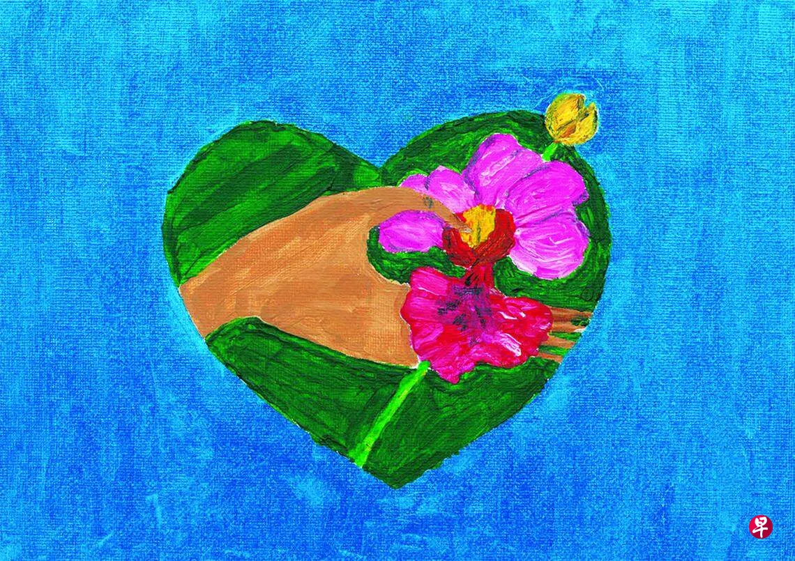 另一款设计出自AWWA失智症日间护理中心杨巧英(80岁)的丙烯画作《爱之心》。画作展示了新加坡国花卓锦万代兰被轻柔地抚在手掌心,一根嫩芽从中萌生,新生命的诞生象征着优雅和坚韧的适应能力。