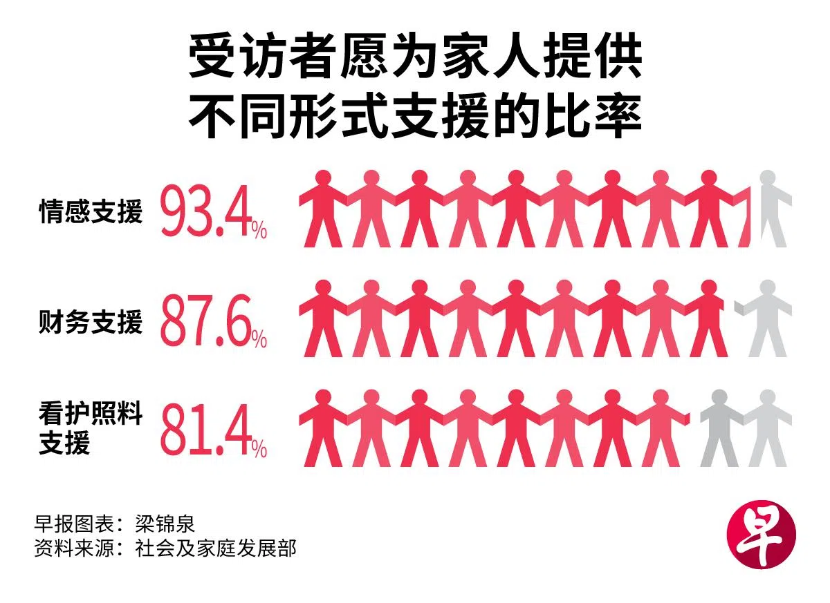 若家人在日常生活上有困难,81.4%受访者愿意定期给予援助。至于财务或情感上的支持,分别有87.6%和93.4%的人表示,家人若有需要,他们不吝于提供。