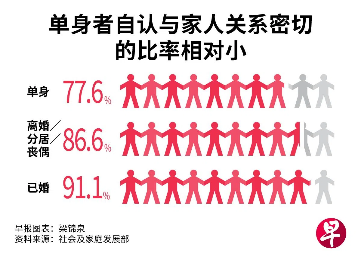 单身者中,77.6%认为与家人关系密切,比率低于已婚者(91.1%),及离婚、分居或丧偶者(86.6%)。至于直系亲属以外的亲戚,53.9%单身者称与他们维持密切联系; 比率也明显比已婚者(75.9%),以及离婚、分居或丧偶者(67.3%)低。
