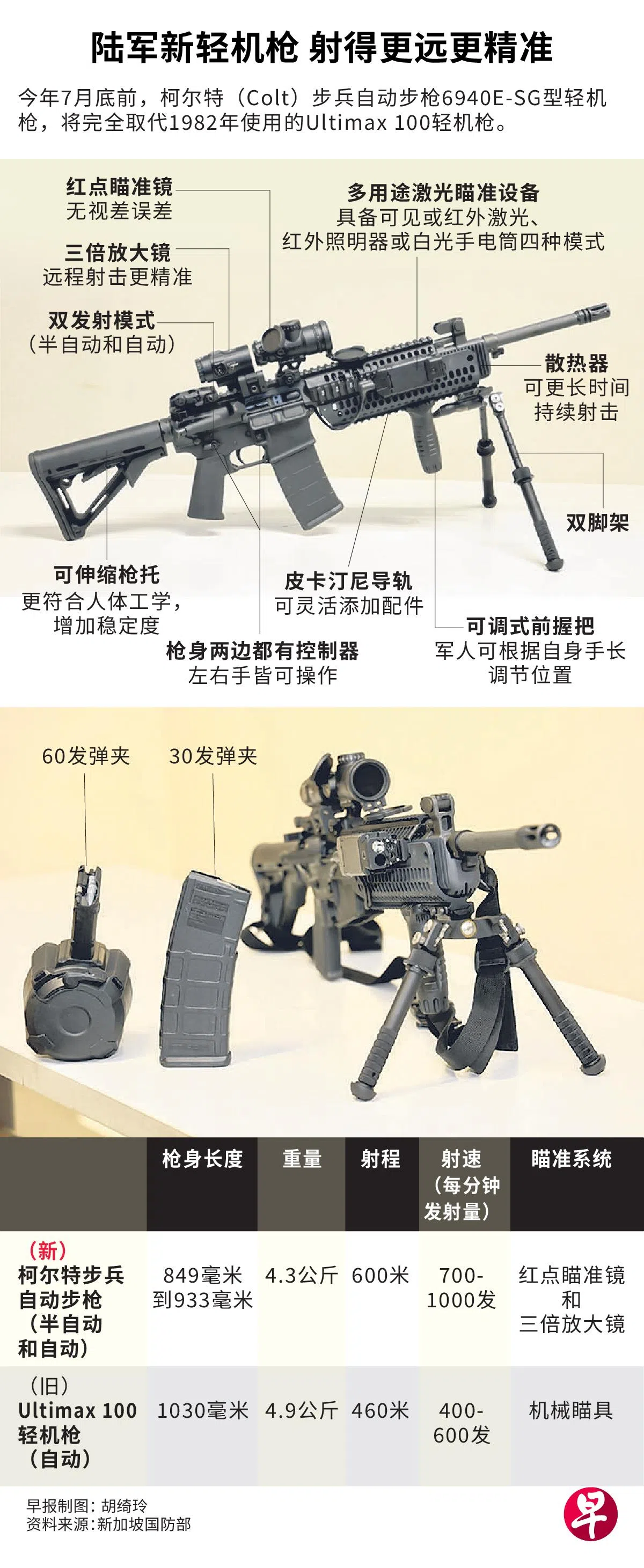 新加坡陆军部队将在今年7月底前,为现役单位全面汰换使用40多年的Ultimax 100型轻机枪,并以更小、更轻,且可射得更远更准的新款柯尔特轻机枪取代。