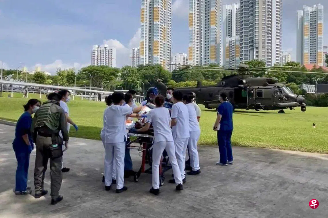 新加坡空军部队星期五在脸书发文说,空军派出救援10号(RESCUE 10)H225M型直升机,顺利将两名船员送到中央医院接受进一步治疗。