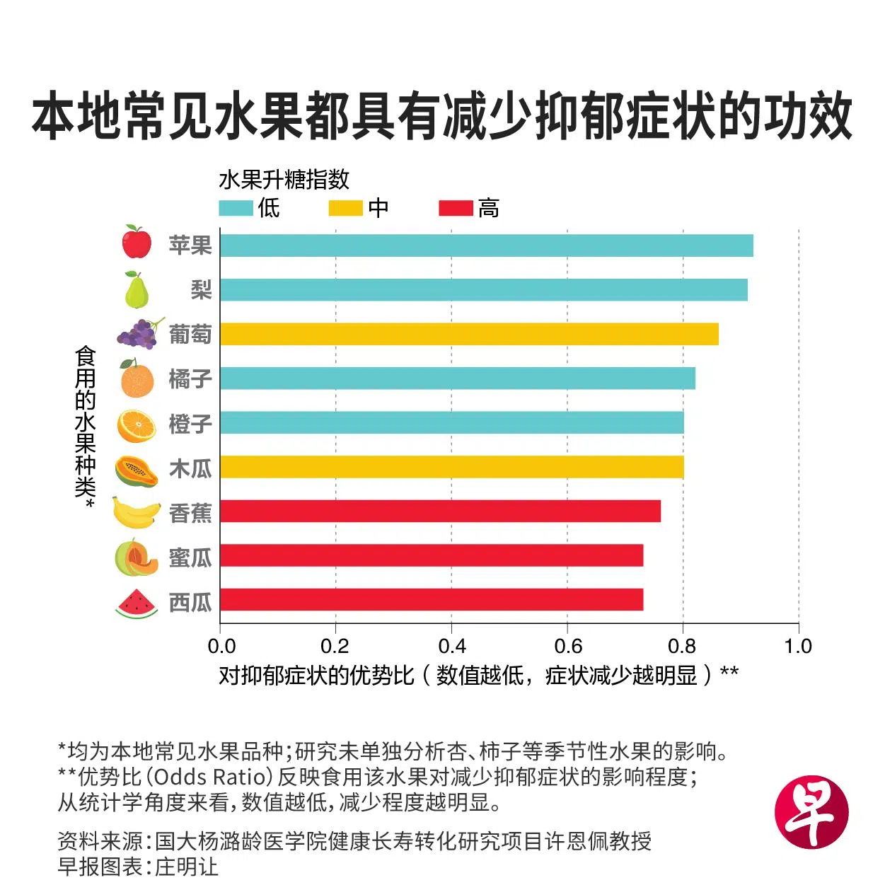 研究也显示,包括苹果、橙、西瓜、蜜瓜等在内的14种本地常见水果,都具有减少抑郁症状的效果。这些水果涵盖了不同价位和含糖量,人们可以根据自身情况选择。