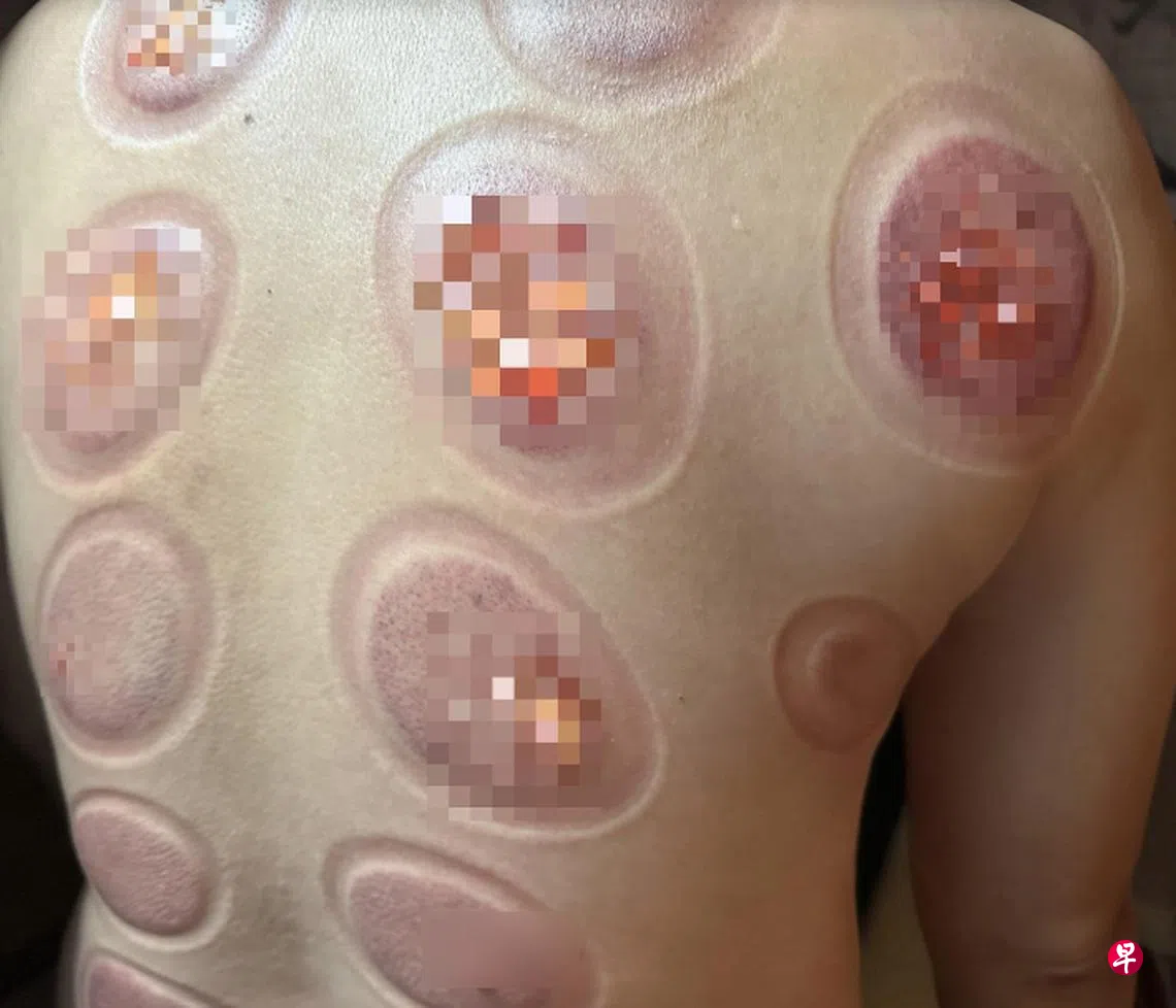 狮城男称到新山商场按摩,签配套做护理,岂料拔罐后,背部满是水泡,前后花了800元治疗。