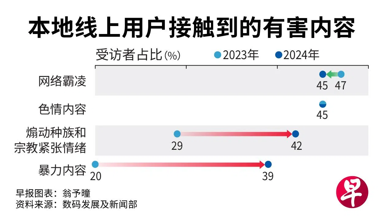 本地今年有多达74%的人在网络上接触到有害内容,比去年增加近一成。在各种有害内容中,煽动种族或宗教紧张情绪和暴力者增加最多。