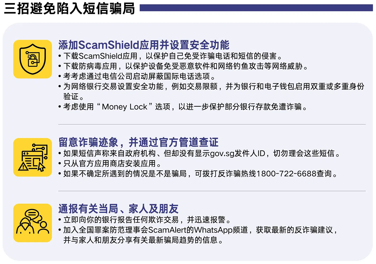 他表示:“电信服务供应商和短信聚合商将持续拦截那些伪造、类似于gov.sg的发件人ID的短信。”
