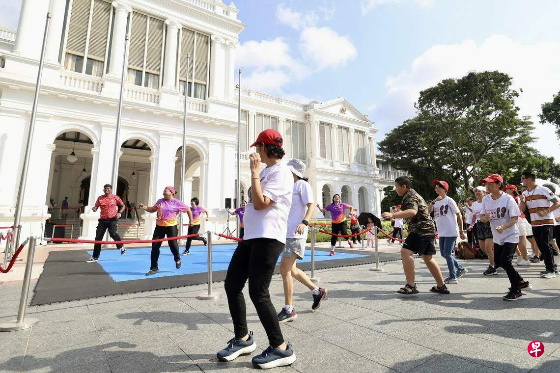 来自马西岭徒步团的113人从福康宁公园,一路走到总统府参加开放日活动。为带动国庆气氛,他们全员身穿白色T恤和戴红色帽子,手里还拿着国旗。