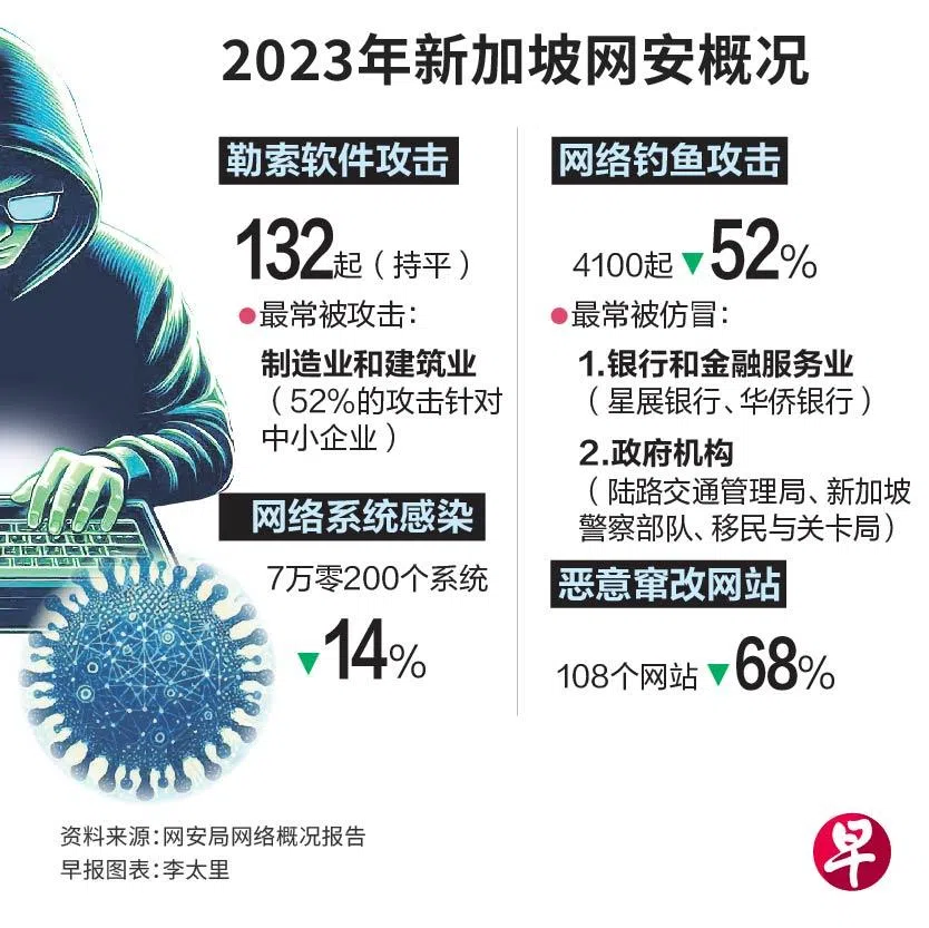 网络安全局星期二(7月30日)发布的2023年新加坡网络概况报告,我国去年的整体网安情况有所改善,隶属于网安局的电脑紧急反应组共接获约4100起网络钓鱼的报案,比2022年减少了约52%,而受影响最大的是金融机构和政府部门。