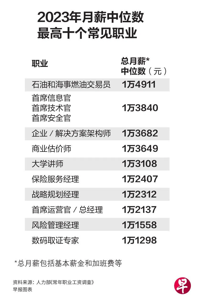 人力部数据显示,在2023年6月,石油和海事燃油交易员的总月薪中位数达到1万4911元,是本地常见职业中最高的,其次是与资讯科技相关的首席信息官、技术官或安全官。