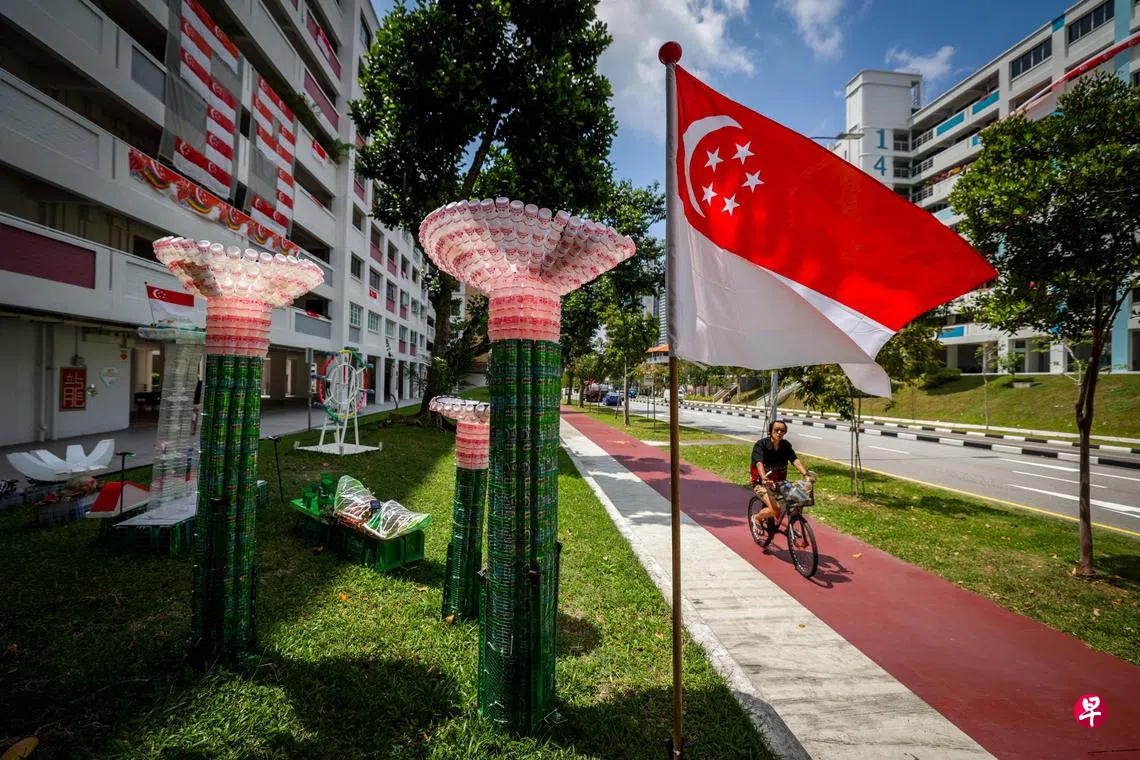 国庆日即将到来,多个邻里挂起各式红白国庆装饰,让全岛洋溢着爱国气氛。除了鲜艳的红白星月旗,一些社区还用心制作了别具特色的装饰品,利用环保材料打造出迷你新加坡地标和蛋糕,为国家生日送上祝福。