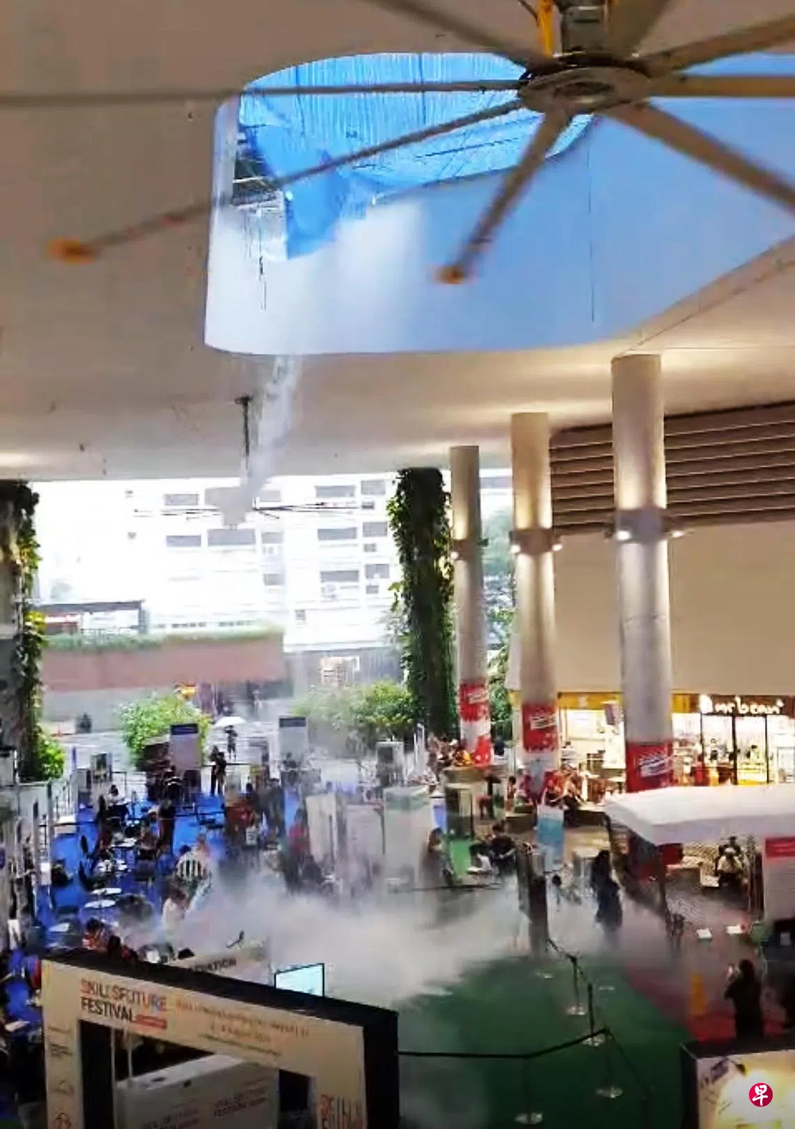 中庭当时正举行西北社理会的技能创前程节(SkillsFuture Festival),雨水落下后砸中摊位,不仅工作人员和公众闪躲不及,现场的电子设备也遭殃,活动只好半路叫停。