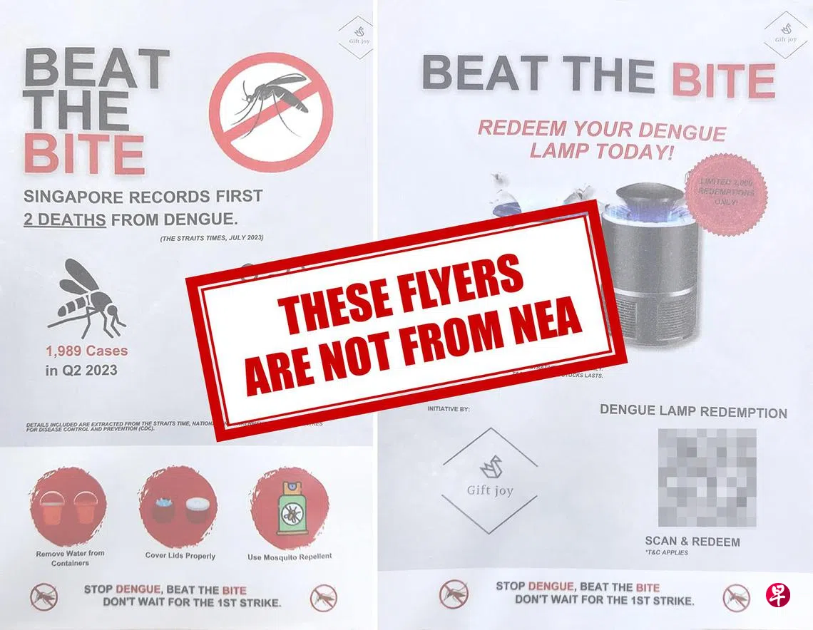 环境局日前在脸书贴文说,当局再次接获通报,有居民表示收到兑换免费防骨痛热症灭蚊灯(dengue lamp)的传单。
