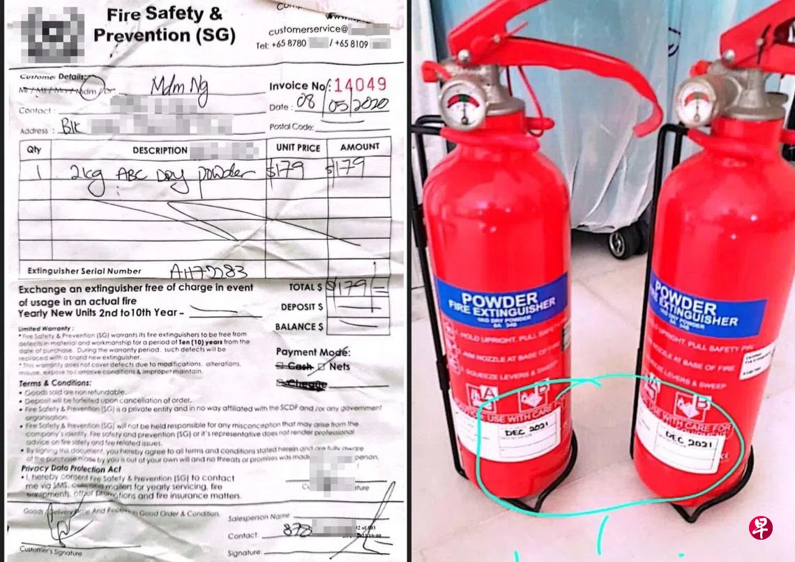 黄兆先后来才发现,母亲从2017年就向上门推销的Fire Safety & Prevention(SG)公司,高价购买灭火器,分别在2017年和2020年以158元和179元购买了两支灭火器。