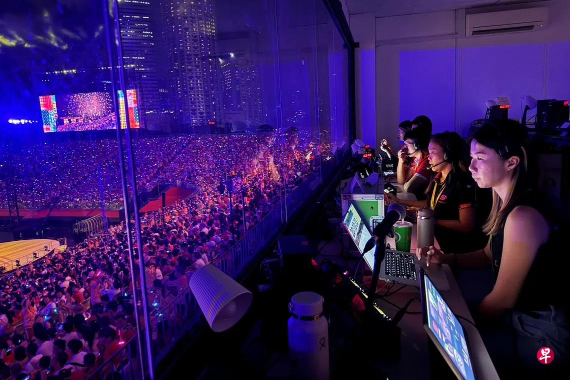 胡夏玲受访说,她负责向场地各处的80多名工作人员传达指示,告知他们在特定时间该做什么。这包括负责串场的四名主持人、15个出入口的负责人、电视导播等。陈雪薇则配合胡夏玲,指导现场的灯光、音响、视频和烟花燃放等。