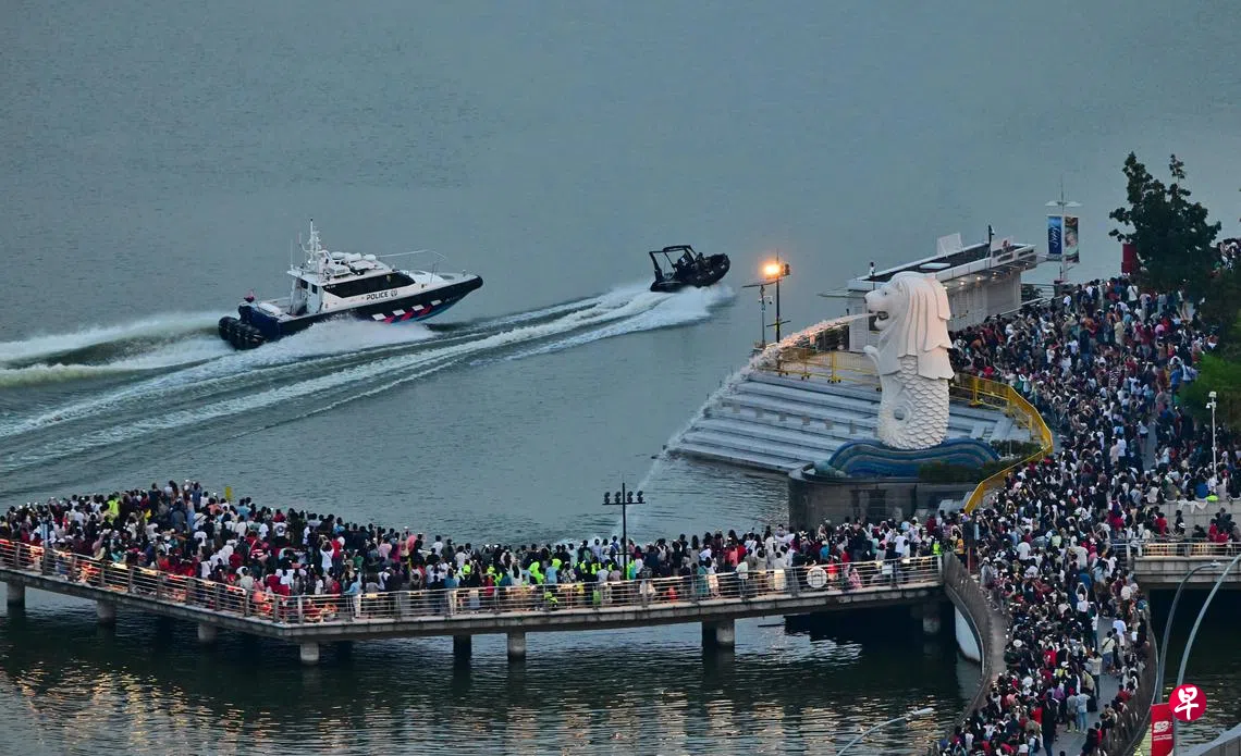 精锐防卫表演堪称今年国庆庆典的重头戏,超过40种装备轮番上阵。新加坡武装部队、警察部队和民防部队,以及公用事业局、红十字会等机构和组织的400名精锐人员参与其中,模拟应对海陆空及数码和民用领域的多重威胁。这场战术演练不仅展示我国面对各种挑战的超强韧性,还通过惊心动魄的场面,令观众切实感受全面防卫40年的深刻意义。