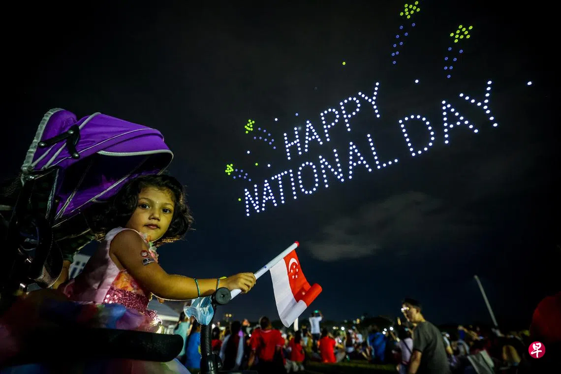 无人机在夜空中“作画”,一幅幅美图,一句句祝语,为新加坡献上满满的祝福。加上璀璨的烟花、民众的激情欢呼,新加坡59岁邻里生日派对完美落幕。