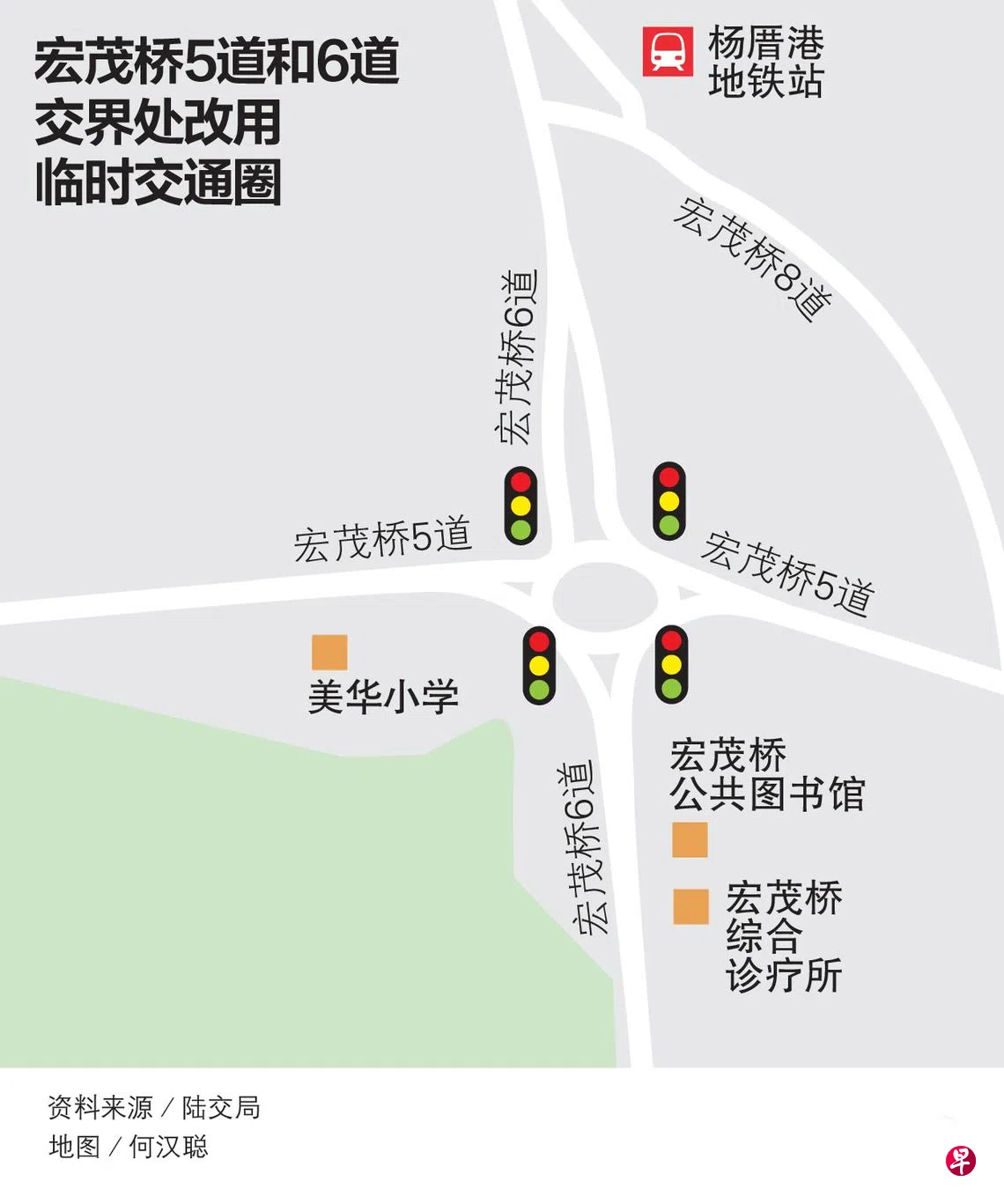 受南北交通廊道建造工程的影响,宏茂桥5道和6道的路口交界处将从8月18日起,改为设有交通灯的临时交通圈。