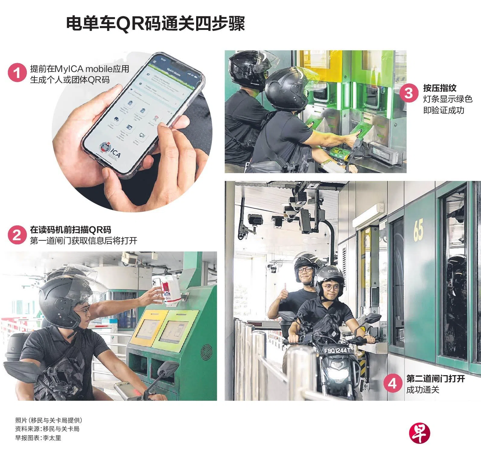 移民与关卡局星期二(13日)发文告公布电单车通道启用QR码通关的细节。这是继汽车乘客和巴士车长后,第三类可扫QR码快速通关的陆路关卡旅客,进一步实现我国在各关卡免护照通关的计划。