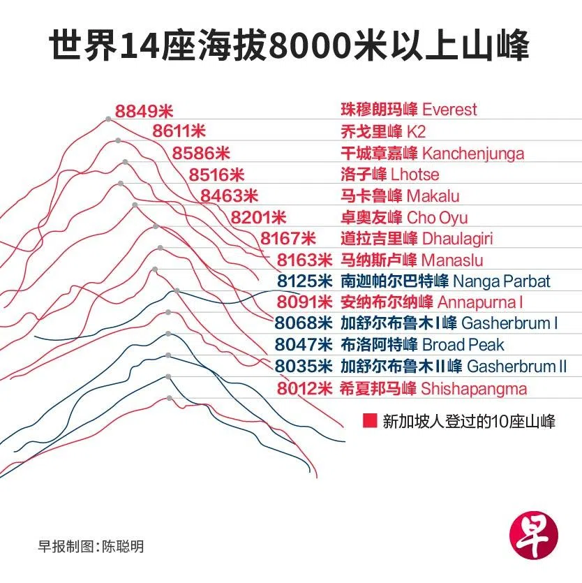 世界共有14座海拔8000米以上山峰,据本地登山社群统计,新加坡人和永久居民的足迹遍布其中10座。
