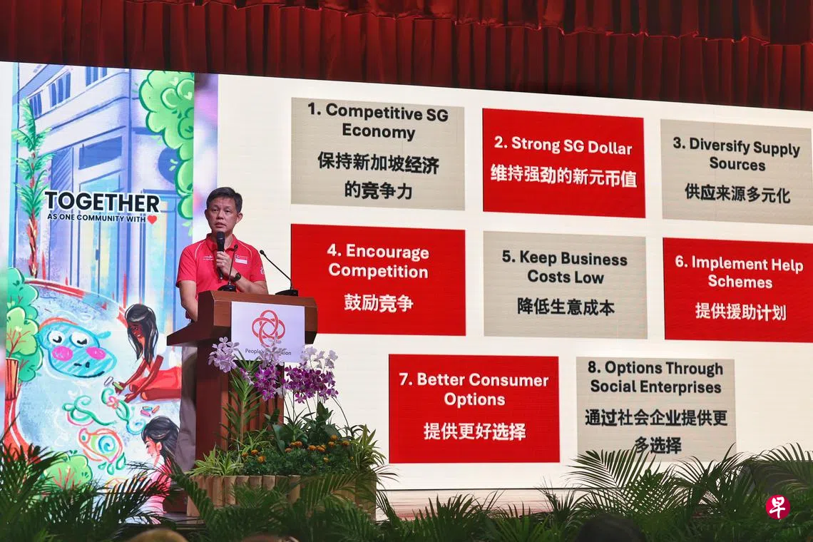他在华语讲话中提到大家关注的生活费上涨问题,并阐述政府已经在做和会继续做的八件事,包括维持我国经济的竞争力、保持新元强劲以提高人们的购买力、扩大物资供应来源、尽可能降低做生意的成本,以及提供社会援助等。