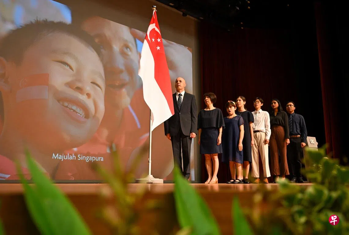 他们一家四口星期天(8月18日)参加在新加坡管理学院举行的全国公民宣誓仪式时,上台带领新公民宣读国家信约和唱国歌。
