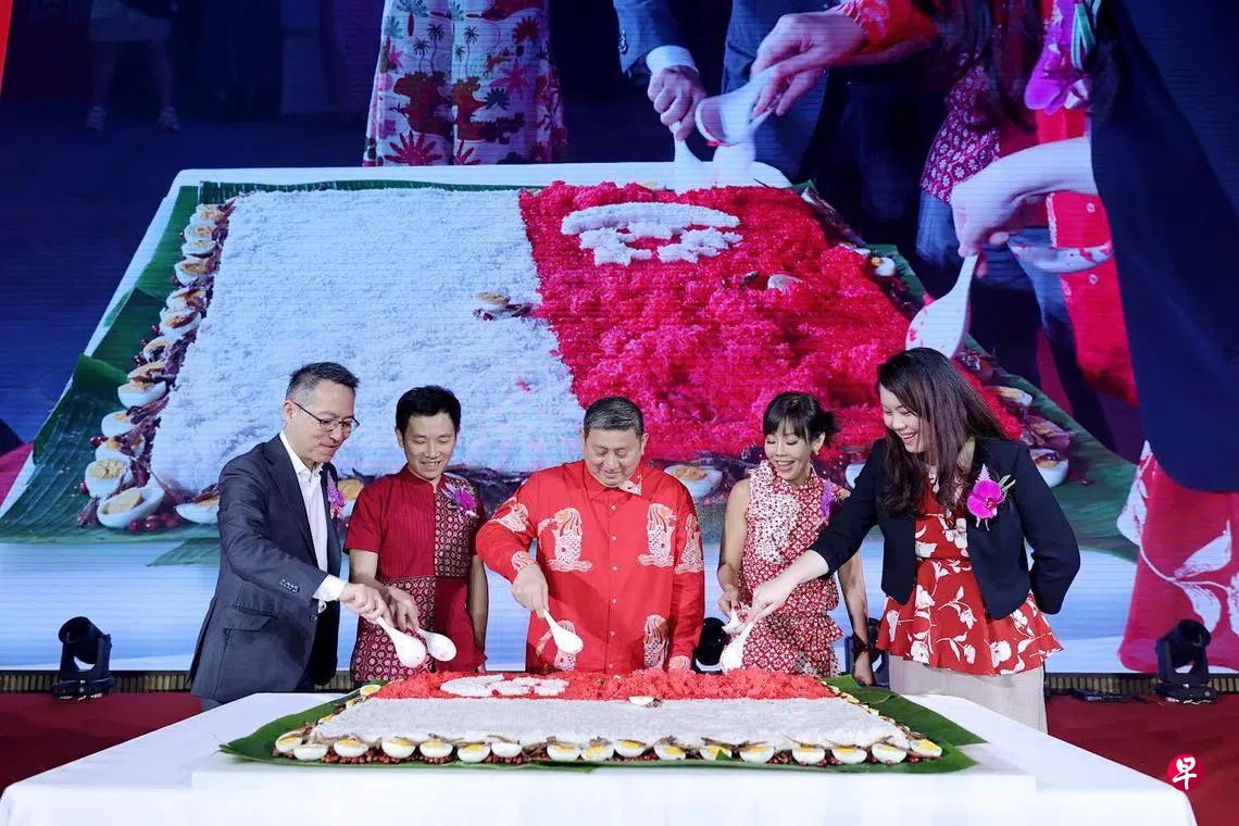 令人印象深刻的是,晚宴上没有普通的蛋糕,而是用椰浆饭巧妙地摆成国旗的形状,让在场的新加坡人都能品尝到家的滋味。