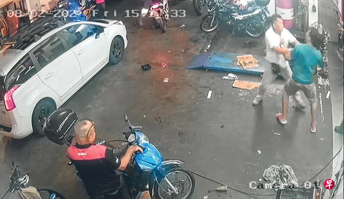 画面显示,绿衣男子先向白衣男子挥拳,不过反被白衣男子连打几拳,击中背部、脸部和后脑勺,并推搡了一下。他们从店外一直打到修车厂内,期间还有至少三名员工劝架。