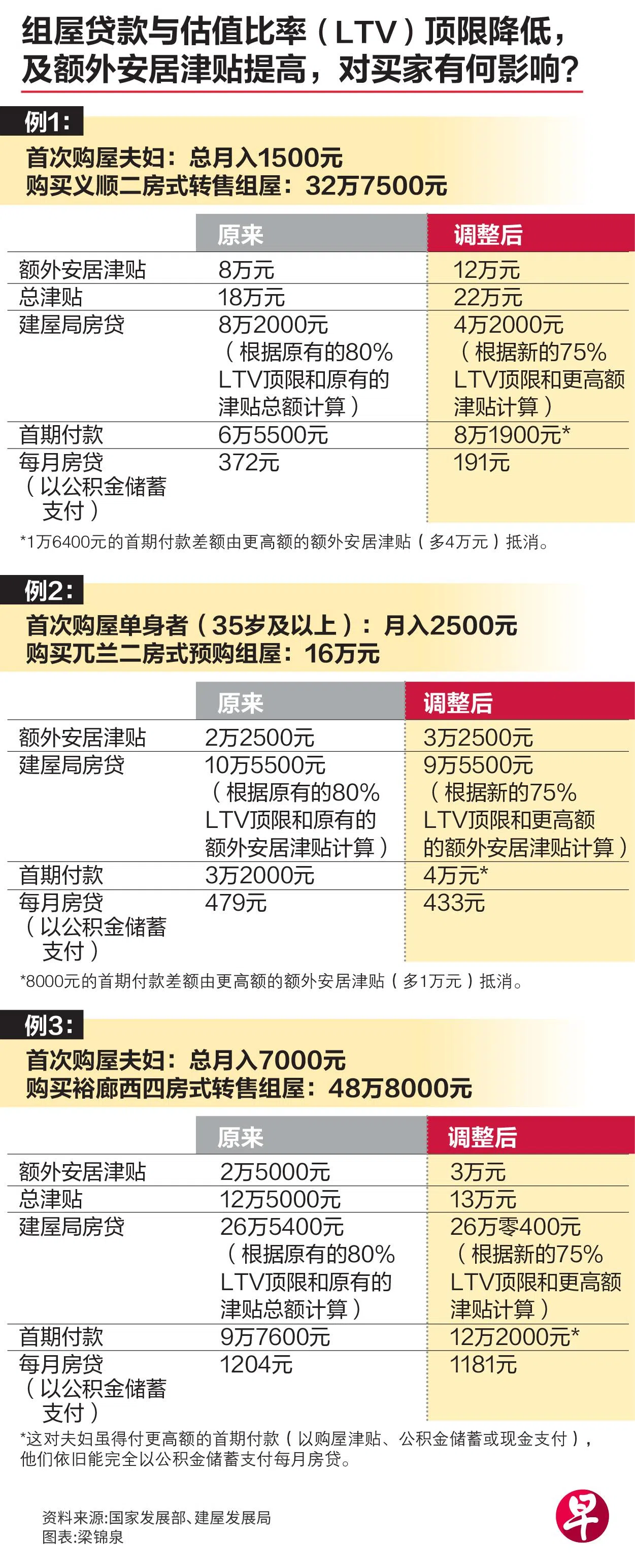 与此同时,这些买家的组屋贷款与估值比率顶限(Loan-To-Value limit,简称LTV顶限)已从80%调低至75%。不过,他们在成功申购新的预购或剩余组屋后,签署购屋协议时须支付的首期额度不变,只有在领取新屋钥匙时,才须用现金或公积金储蓄支付额外的5%。