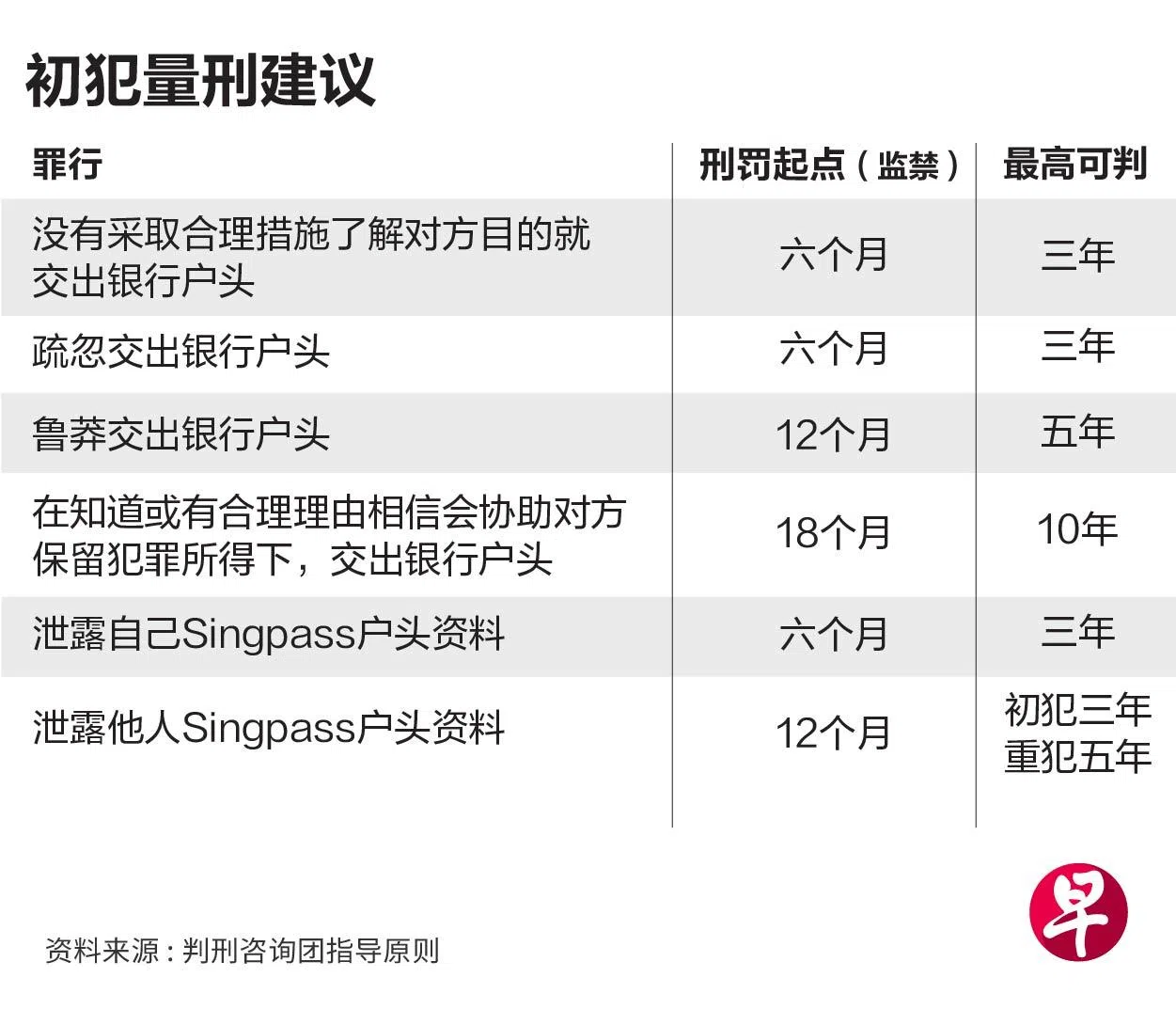 指导原则旨在明确针对修改后的法令如何量刑。为起到强烈的阻吓作用,指导原则建议对涉及交出银行户头或Singpass户头的罪行,判处较长的监禁。这项建议适用于包括21岁以下青少年的所有罪犯,少年法庭审理的罪犯除外。