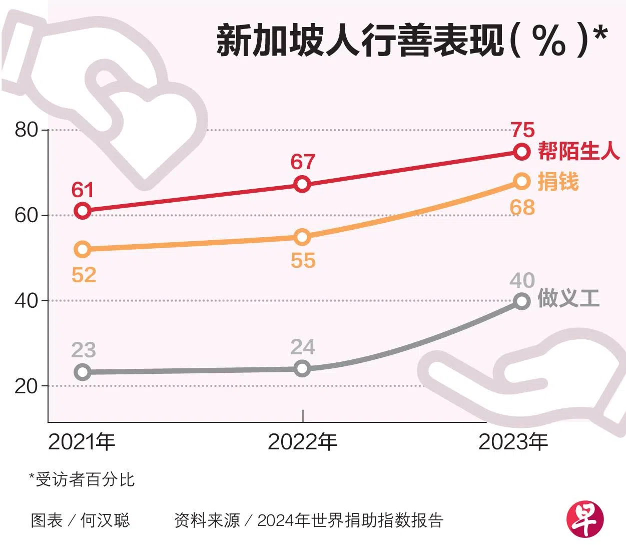 根据报告,去年有75%的新加坡受访者帮助过陌生人、68%捐过钱、40%拨出时间当义工。