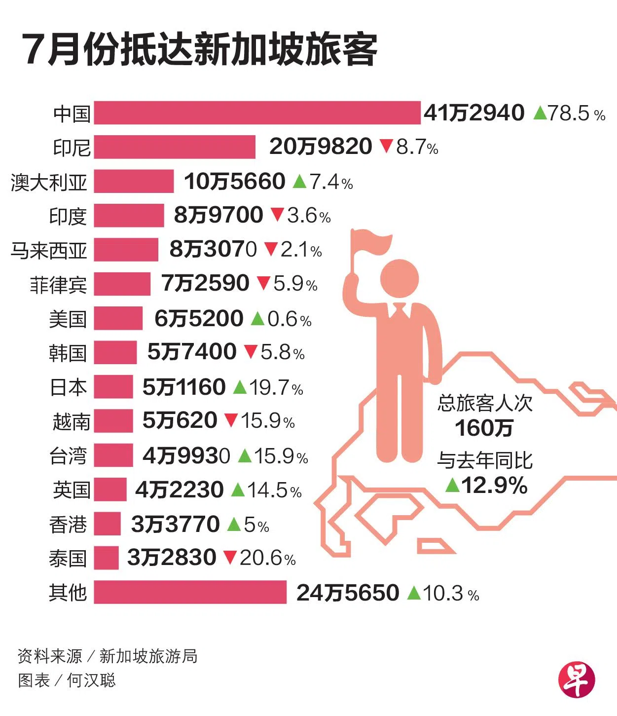 今年7月入境新加坡的旅客人次达到160万,较去年同期的142万人次增加近13%。今年首七个月的旅客入境人次共计978万,与去年同比增加近三成。