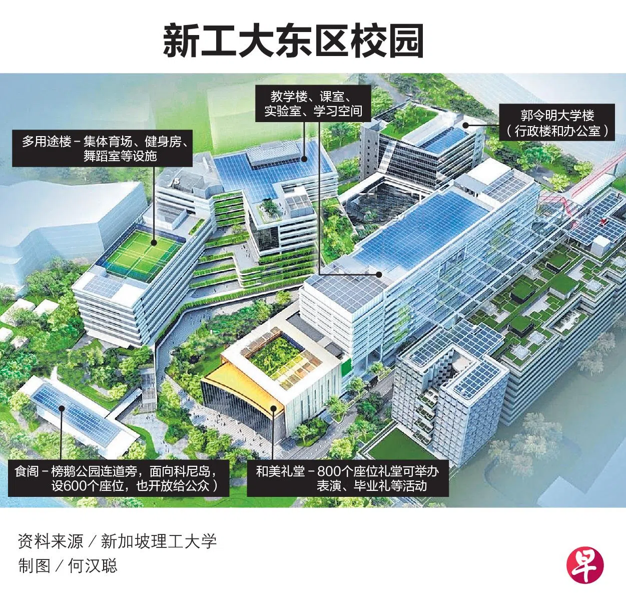 位于榜鹅海岸路的新工大2019年开始兴建,斥资超过10亿元建造,占地约9万平方米,已完工的东区校园(Campus Court)在科尼岛对面,除了行政和教学楼,也有大礼堂、体育设施,以及食阁等。