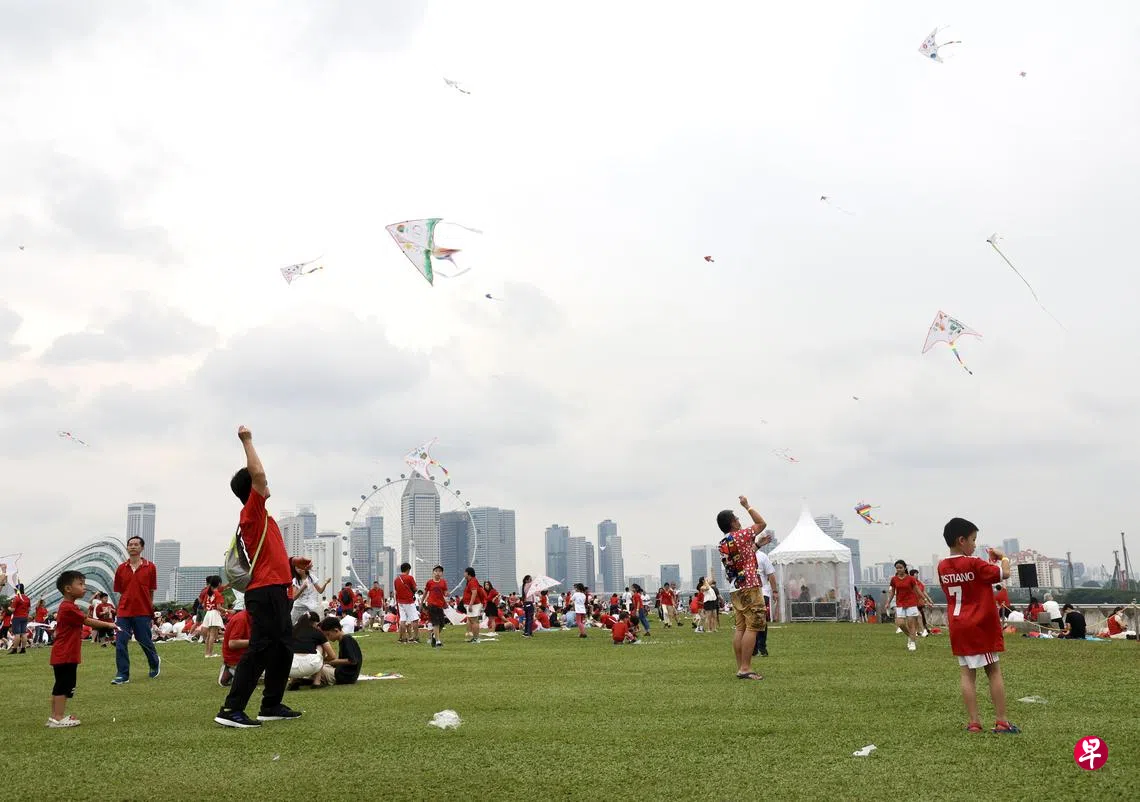 320户家庭星期天(8月25日)齐聚滨海堤坝,参加华社自助理事会举办的健康生活节。身着红衣的参与者乐在其中,与家人参加了一系列户外活动,包括放风筝、拔河、踢毽子、丢飞盘、玩健球,以及做健康操等,增进亲子关系。