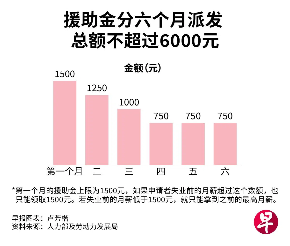援助金将分期且以递减方式派发。例如,失业前月入1500元或以上的申请者,一旦申请获批,第一个月可领取1500元的援助金;接下来三个月逐月减少250元,第五和第六个月可领750元。其间若找到新工作,下一个月就不能再领取援助金。