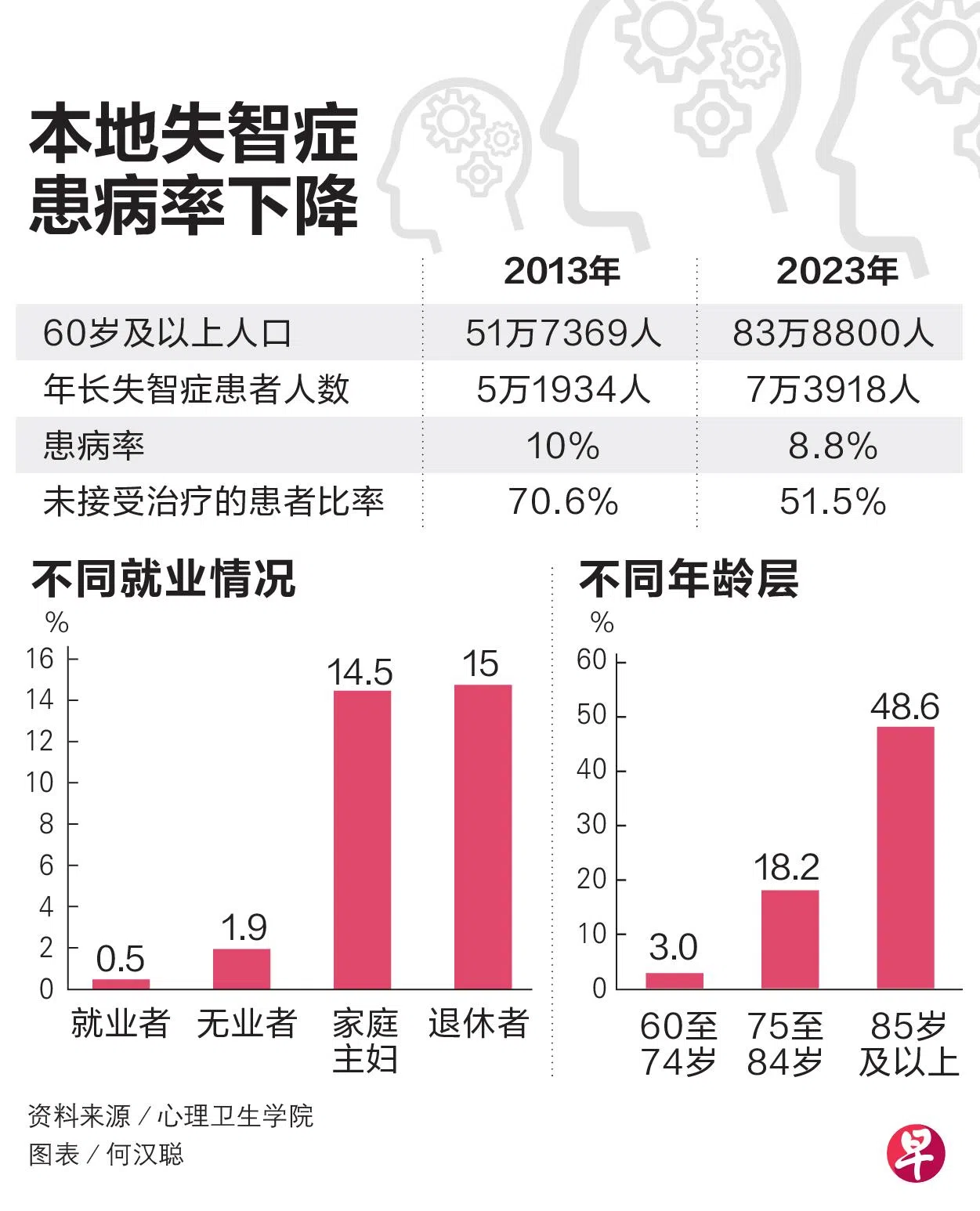 过去10年,本地年长者患失智症的比率有所下降,主要因为就业率及教育程度提升,以及中风率降低。值得关注的是,退休者和家庭主妇的失智症患病率,分别比就业年长者高出11.3倍和9.4倍。