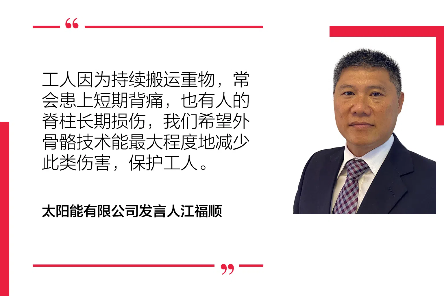 江福顺说:“背痛是员工需拿病假的常见原因之一。在建筑和物流行业,工人因为持续搬运重物,常会患上短期背痛,也有人的脊柱长期损伤,我们希望外骨骼技术能最大程度地减少此类伤害,保护工人。”