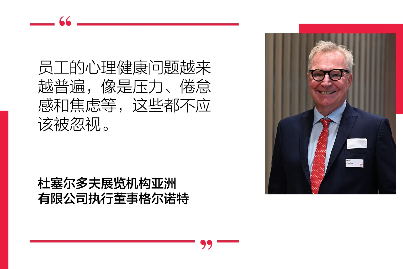 他说:“关注工作场所员工的心理健康和福祉,是今年展会一个重要的主题。我们将针对问题举办多场小组会议和研讨会。员工的心理健康问题越来越普遍,像是压力、倦怠感和焦虑等,这些都不应该被忽视。”