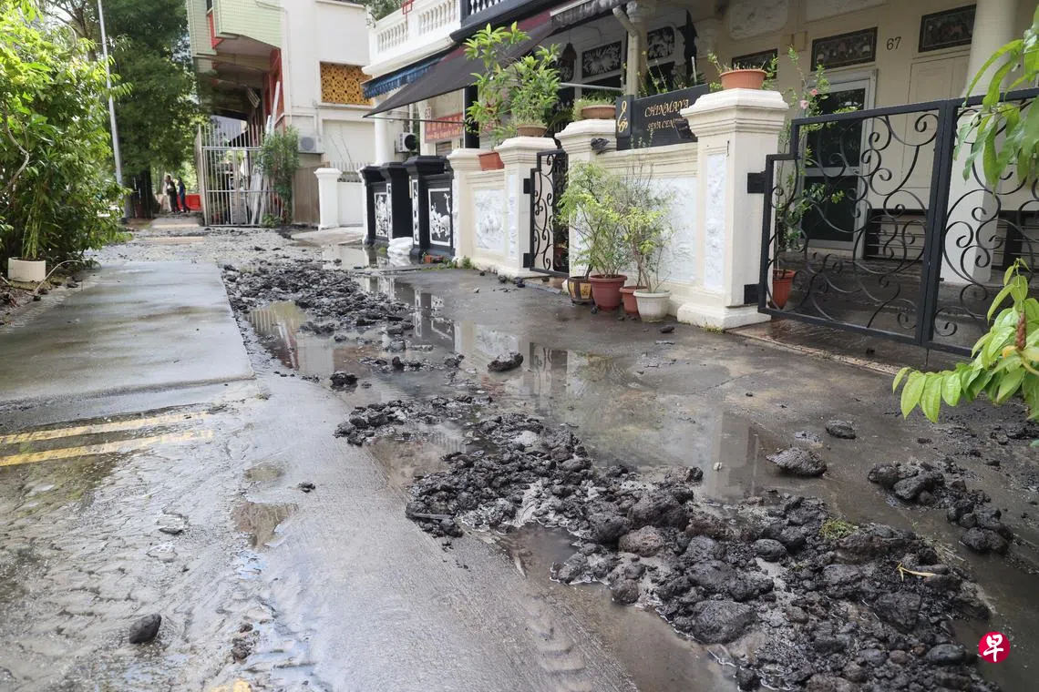 记者星期天早上约8时走访时,积水情况已经改善,但仍留下了水渍以及被冲散的泥土。另外,大约五六十米长的路段被封锁。