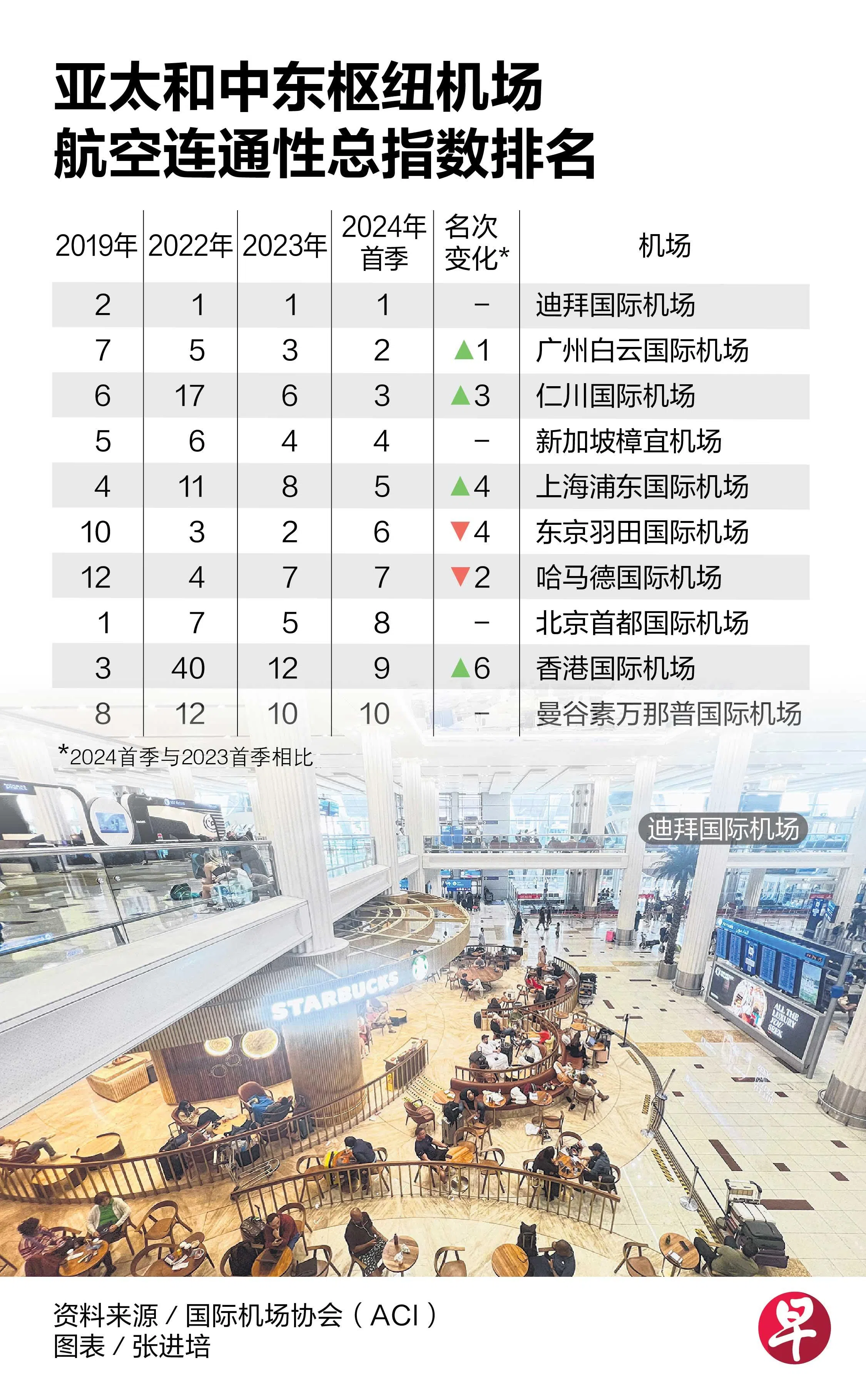 过去几年,新加坡樟宜机场在亚太和中东地区枢纽机场航空连通性排行榜上表现不俗,2023年更是从2022年的第六名升至第四名;迪拜过去两年则维持第一的名次,东京羽田国际机场和广州白云机场则分别升至第二和第三。