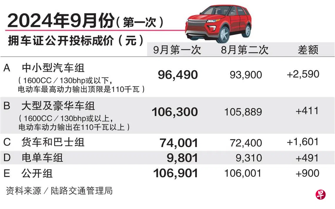 在最新一轮拥车证公开投标活动中,所有组别的成价都上升。中小型汽车组(A组)成价在汽车组别中增幅最大,上涨2590元,报9万6490元,写下今年最高纪录。